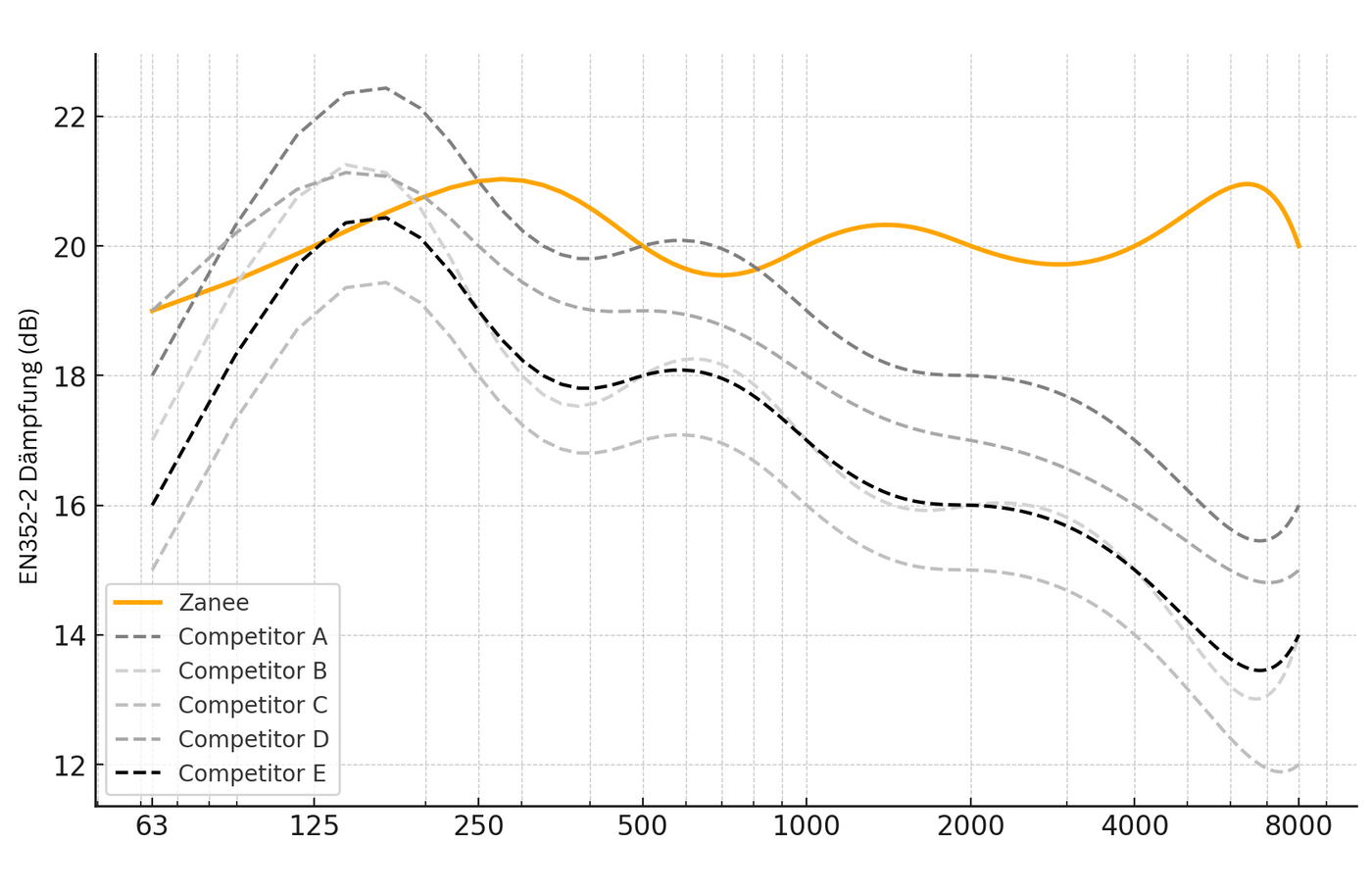 Im Vergleich zu anderen führenden Marken bietet Zanee eine besonders gleichmässige und stabile Klangqualität. Durch die gleichmässige Absorption von Vibrationen über alle Tonhöhen hinweg bleibt der Klang natürlich und ausgewogen, als würde man ohne Earplugs hören.